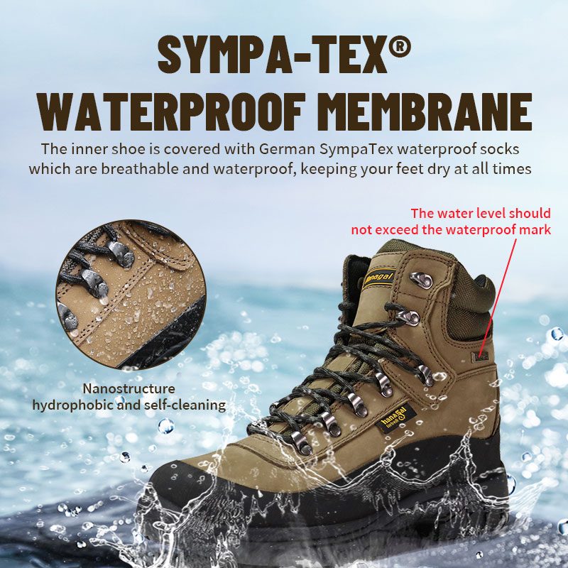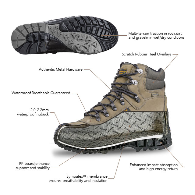Ang panloob na sapatos ay natatakpan ng German Sympatex na hindi tinatablan ng tubig na mga medyas na makahinga at hindi tinatablan ng tubig, na pinananatiling tuyo ang iyong mga paa sa lahat ng oras.