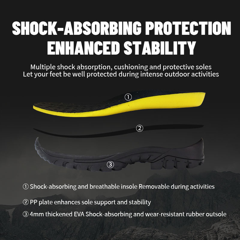 Ang multi-layer cushioning ay sumisipsip ng shock at nagpoprotekta sa bawat hakbang—pinananatiling matatag at secure ang iyong mga paa sa pinakamahirap na lupain.