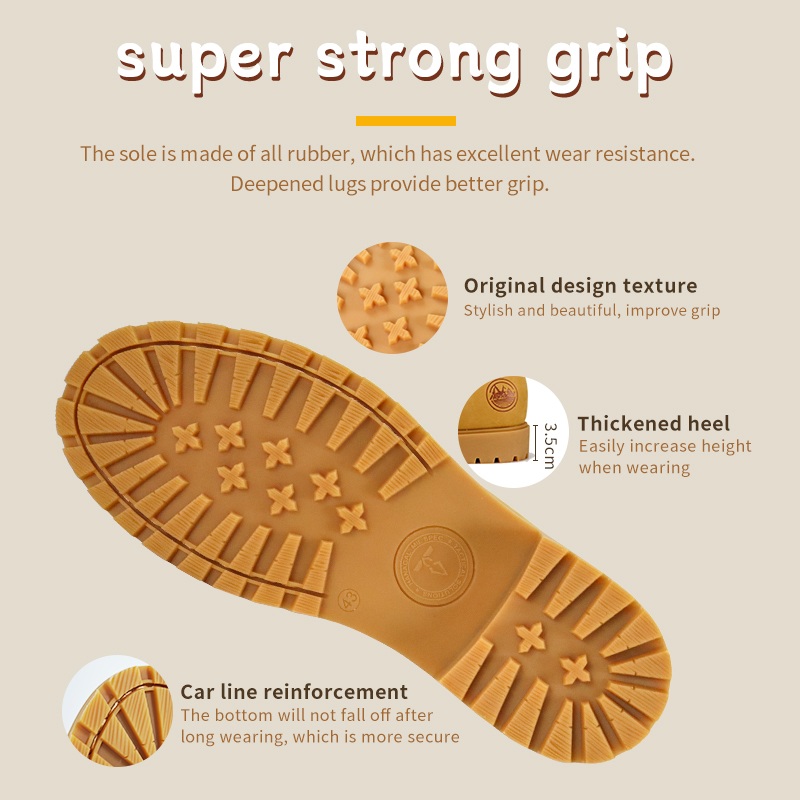 ①Original Design Texture - Mukhang maganda. Mahusay ang pagkakahawak. Simple lang. ②Makapal na Takong - Mahina ang pagtaas. Instant confidence. Hakbang nang walang kahirap-hirap. ③Car Line Reinforcement - Isuot ang mga ito nang husto, isuot ang mga ito ng mahaba. Ang nag-iisang nananatili kung saan ito nararapat.
