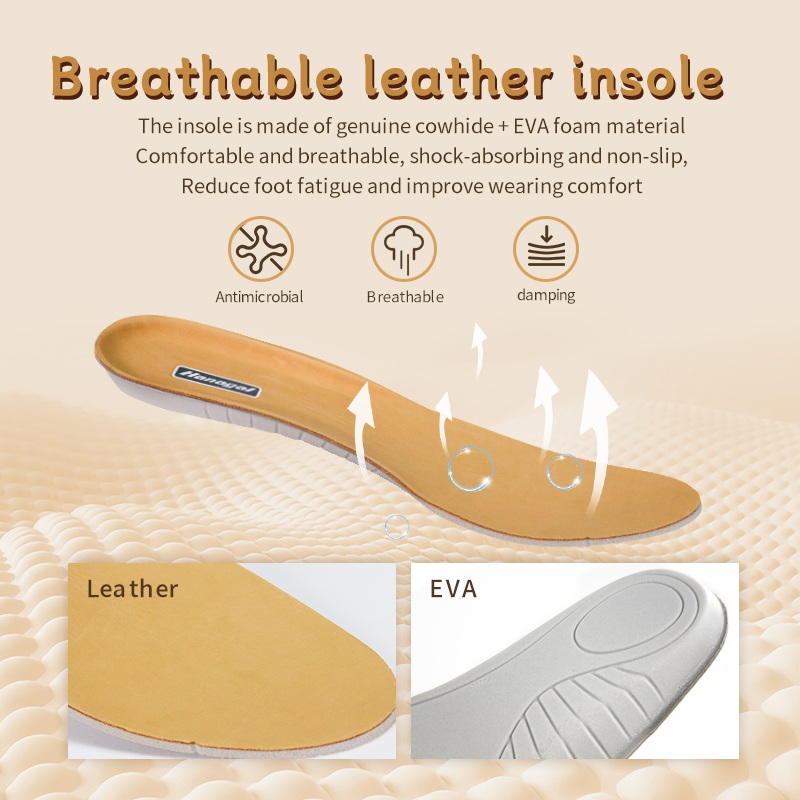Genuine cowhide + EVA foam insole—nakakahinga, sumisipsip ng shock, at hindi madulas. Pinapanatili ang pakiramdam ng mga paa na sariwang milya pagkatapos ng milya.