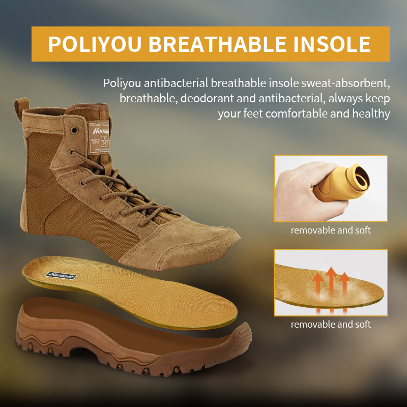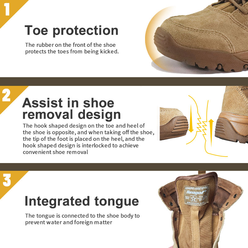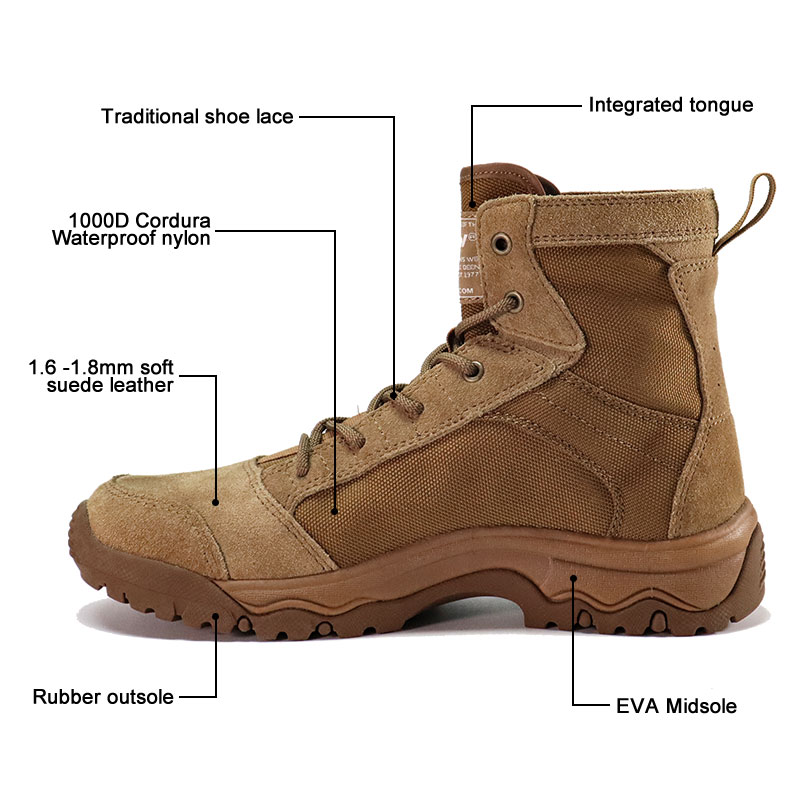 Ang mga Cordura Fabric Rubber Desert Tactical Boots na ito ay nasa stock at handa nang ipadala, na may mga order na nagsisimula sa 10 pares lamang. Para sa higit pang mga detalye o mga katanungan sa pagpepresyo, huwag mag-atubiling makipag-ugnayan anumang oras. Available din ang pag-customize na may pinakamababang order na 800 pares. At ang modelong ito ay may mga sumusunod na pakinabang: