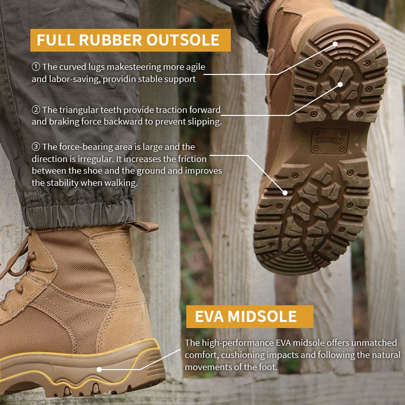 Idinisenyo para sa pinakamahirap na lupain, ang Cordura Fabric Rubber Desert Tactical Boots ay naghahatid ng magaan na kaginhawahan at seryosong katatagan—upang makagalaw ka nang may kumpiyansa sa ibabaw ng bato, buhangin, at lahat ng nasa pagitan. Sa ilalim ng paa, ang isang high-performance na EVA midsole ay bumabalot sa bawat strike at natural na gumagalaw sa iyong hakbang. At ang rubber outsole? Hinahawakan nito ang maluwag na lupa at ang mga magaspang na daanan—ginawa upang umangkop, ginawa upang tumagal.