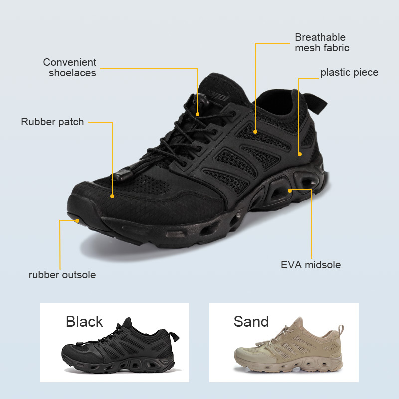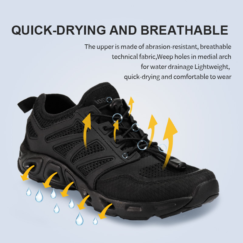 -Magaan at makahinga -Drainage at mabilis na pagkatuyo -EVA shock absorbing midsole -Maginhawang Disenyo ng Sintas ng Sapatos