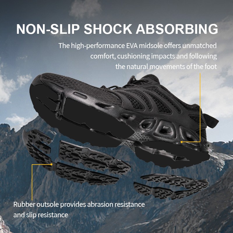 Ang EVA Shock Absorbing Trekking Shoes ay ginawa para sa trail—basa o tuyo. Gamit ang mabilis na pagkatuyo ng mga materyales at mga drainage port sa arko, mabilis itong bumubuhos ng tubig kapag ikaw ay mula sa batis patungo sa tuktok. Ang isang rubber heel patch ay nakakandado sa katatagan, habang ang EVA midsole ay naghahatid ng malambot, nakaka-shock-absorbing ginhawa sa ilalim ng paa. At ang masungit na rubber outsole? Ginawa upang mahigpit na hawakan ang halos anumang bagay—bato, putik, maluwag na graba. Ito ay amphibious, maliksi, at binuo para lumipat kasama mo.