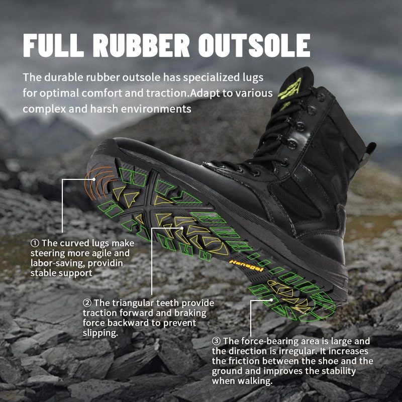 Ang matibay na rubber outsole ay may mga espesyal na lug para sa pinakamainam na kaginhawahan at traksyon. Iangkop sa iba't ibang kumplikado at malupit na kapaligiran