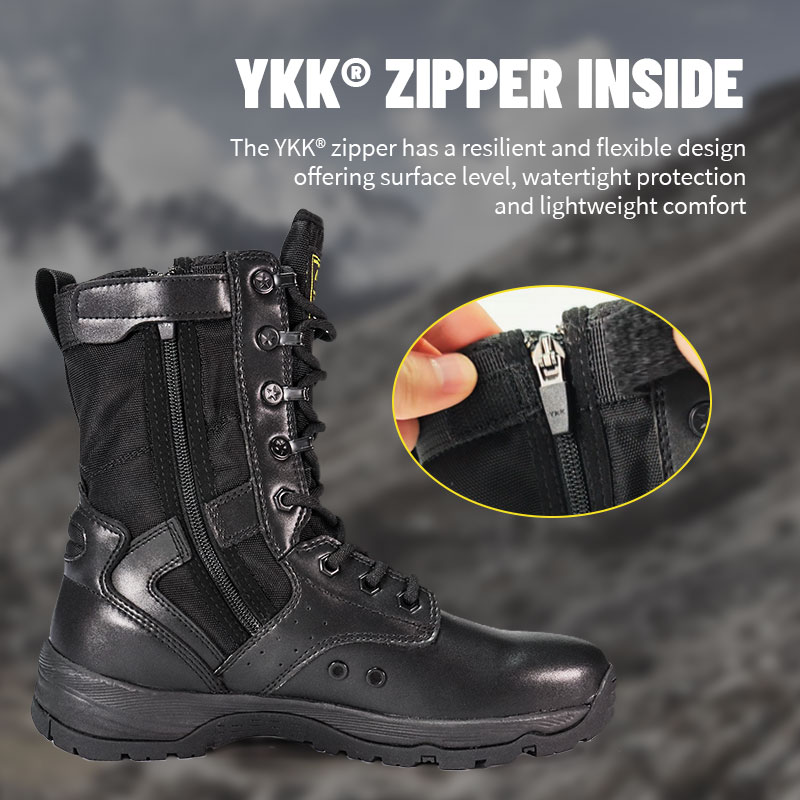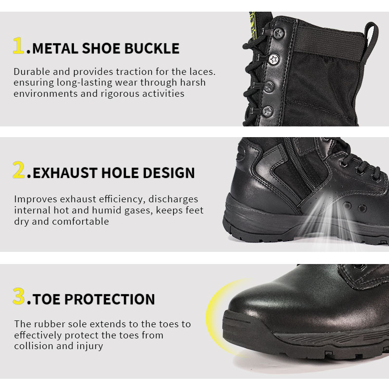 Ginawa para sa mga tauhan ng militar at mga mahilig sa labas, ang Full Rubber Outsole Police Boots ay nag-aalok ng komportable, pambalot na akma na may seryosong katatagan sa masungit na lupain. Ang isang gusseted na dila ay nagpapanatili ng mga labi at nananatiling nakasentro, habang ang matibay na suede at nylon na pang-itaas ay tumatayo sa mahihirap na kondisyon. Ginagawang madali ng YKK zipper ang on-and-off—upang manatiling nakatutok ka sa misyon sa hinaharap.