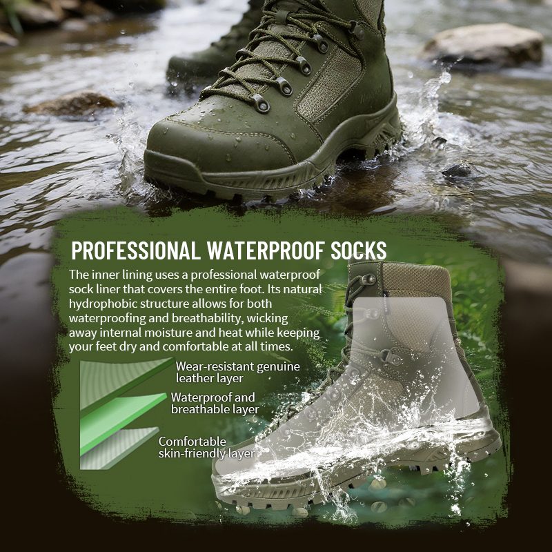 Ang panloob na lining ay gumagamit ng isang propesyonal na medyas na hindi tinatablan ng tubig na sumasaklaw sa buong paa. Ang natural na hydrophobic na istraktura nito ay nagpapanatili ng tubig sa labas habang hinahayaan ang init at pawis na tumakas—para manatiling tuyo at komportable ang iyong mga paa.